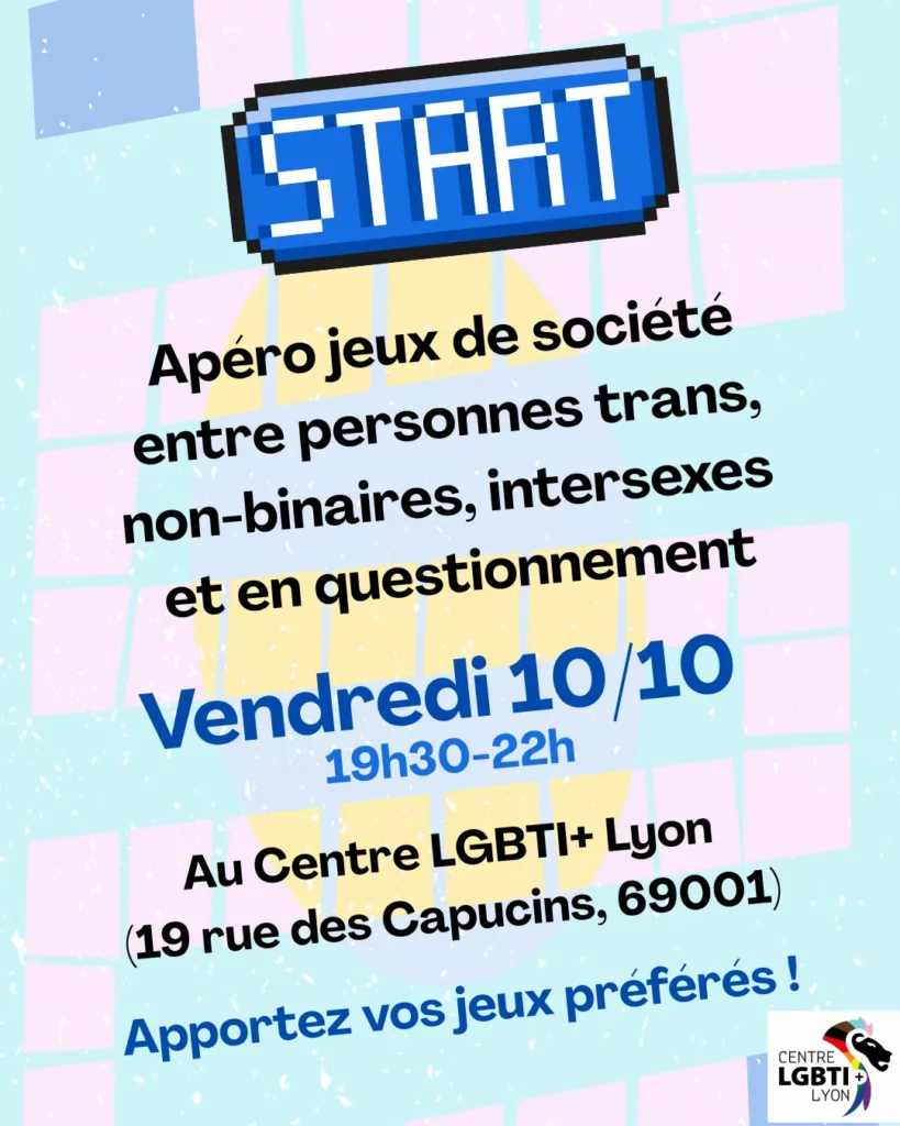 La commission Trans-Inter-Non Binaire du Centre LGBTI+ Lyon invite les personnes concernées et celles en questionnement à se retrouver à nouveau pour un temps convivial de jeu, cette fois-ci en soirée le vendredi 10 octobre. À partir de 19h30 et jusqu’à 22h, venez (re)découvrir des classiques, des jeux originaux ou proposez vous même vos jeux […]