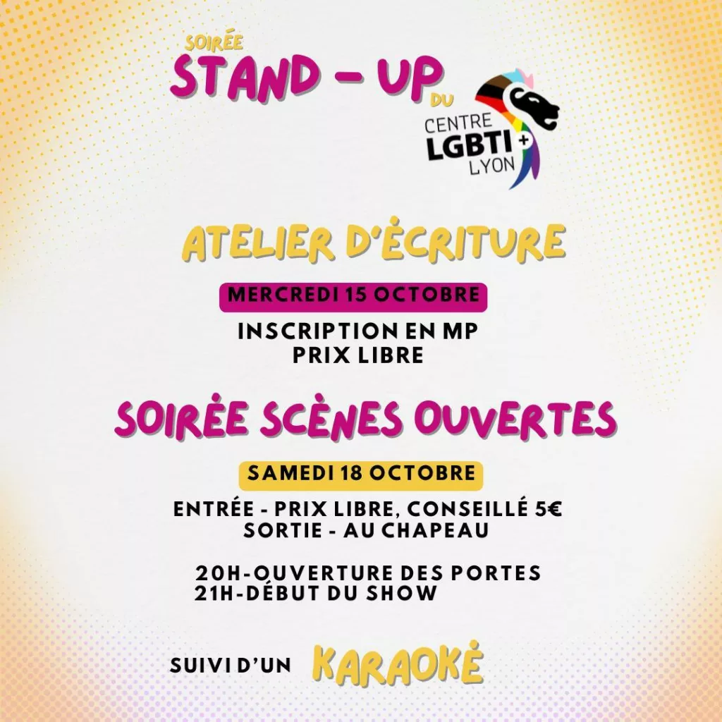 Et si vous avez envie de vous lancer dans le stand up, un atelier d’Ă©criture vous est proposĂ© chaque mois. Le prochain aura lieu le mercredi 15 octobre au Centre LGBTI+ Lyon (informations auprĂšs de Louise par message privĂ© sur son compte Instagram @louise_contreattaque ou par e-mail sur contact@centrelgbtilyon.org)
