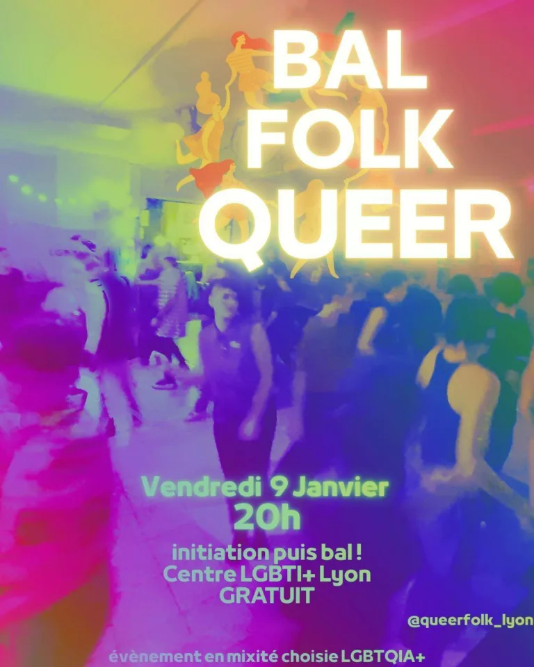 Le Bal Folk Queer c’est un moment convivial pour la communautĂ© LGBTQIA+/en questionnement, l’occasion d’apprendre et de danser ensemble plein de danses collectives, Ă deux, Ă quatre, âŠ