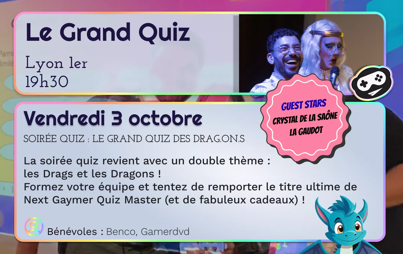 Formez votre équipe et répondez aux questions concoctées par Benco & GamerDvd69, et profitez de performances exceptionnelles par Crystal de la Saône et La Gaudot !