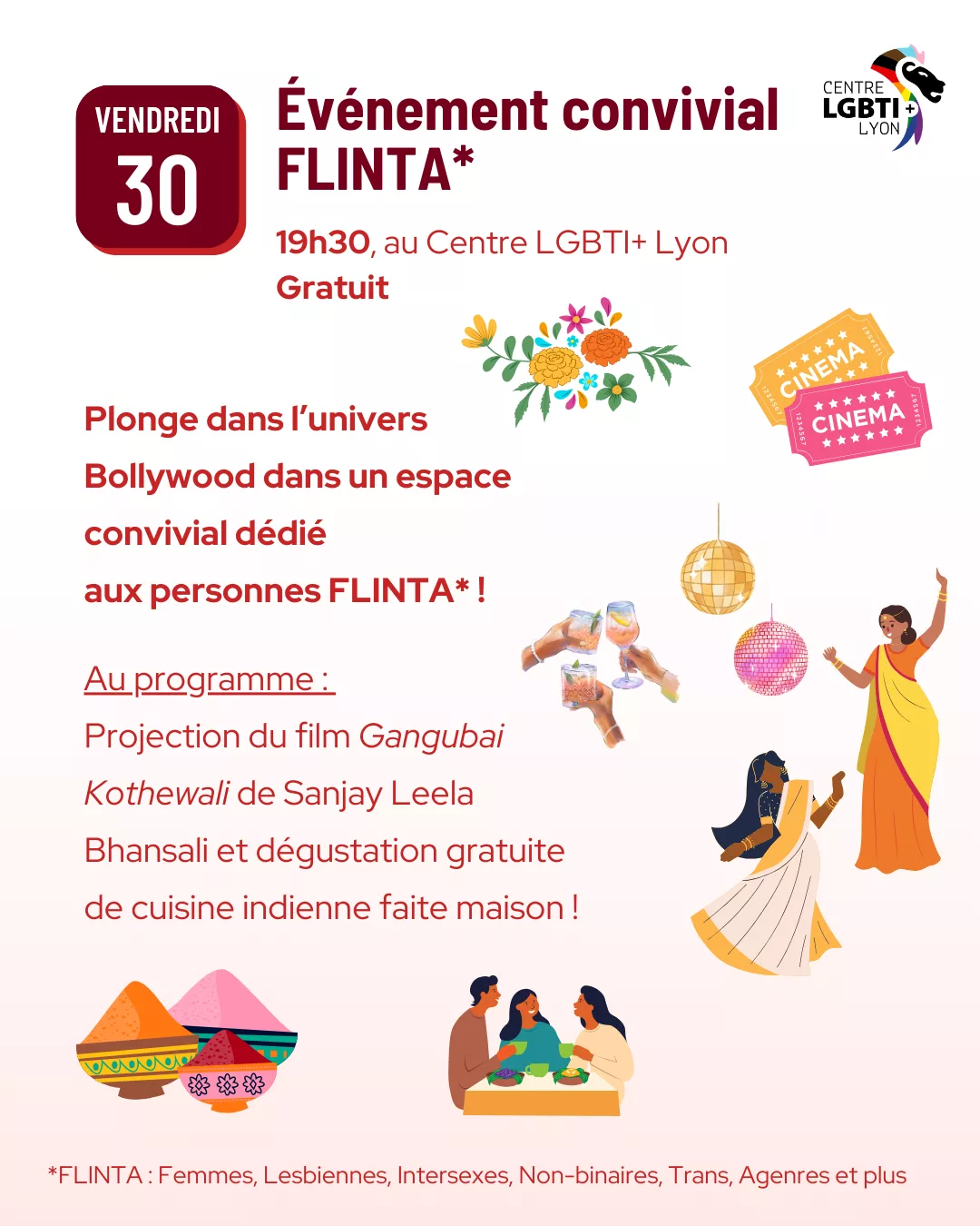 Gratuit, à 19h30, au Centre LGBTI+ Lyon Plonge dans l’univers Bollywood dans un espace convivial dédié aux personnes FLINTA* ! Au programme : *FLINTA : Femmes, Lesbiennes, Intersexes, Non-binaires, Trans, Agenres et plus