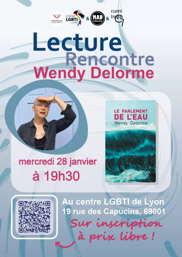 La Bibliothèque du Centre LGBTI+ Lyon, en partenariat avec la librairie de La Madeleine et Sacha Earendel, est heureuse d’accueillir Wendy Delorme lauréate du prix Gouincourt 2025, pour une lecture et une rencontre autour de son nouveau roman : Le Parlement de l’Eau. au Centre LGBTI+ Lyon, 19h30 | Sur inscription à prix libre